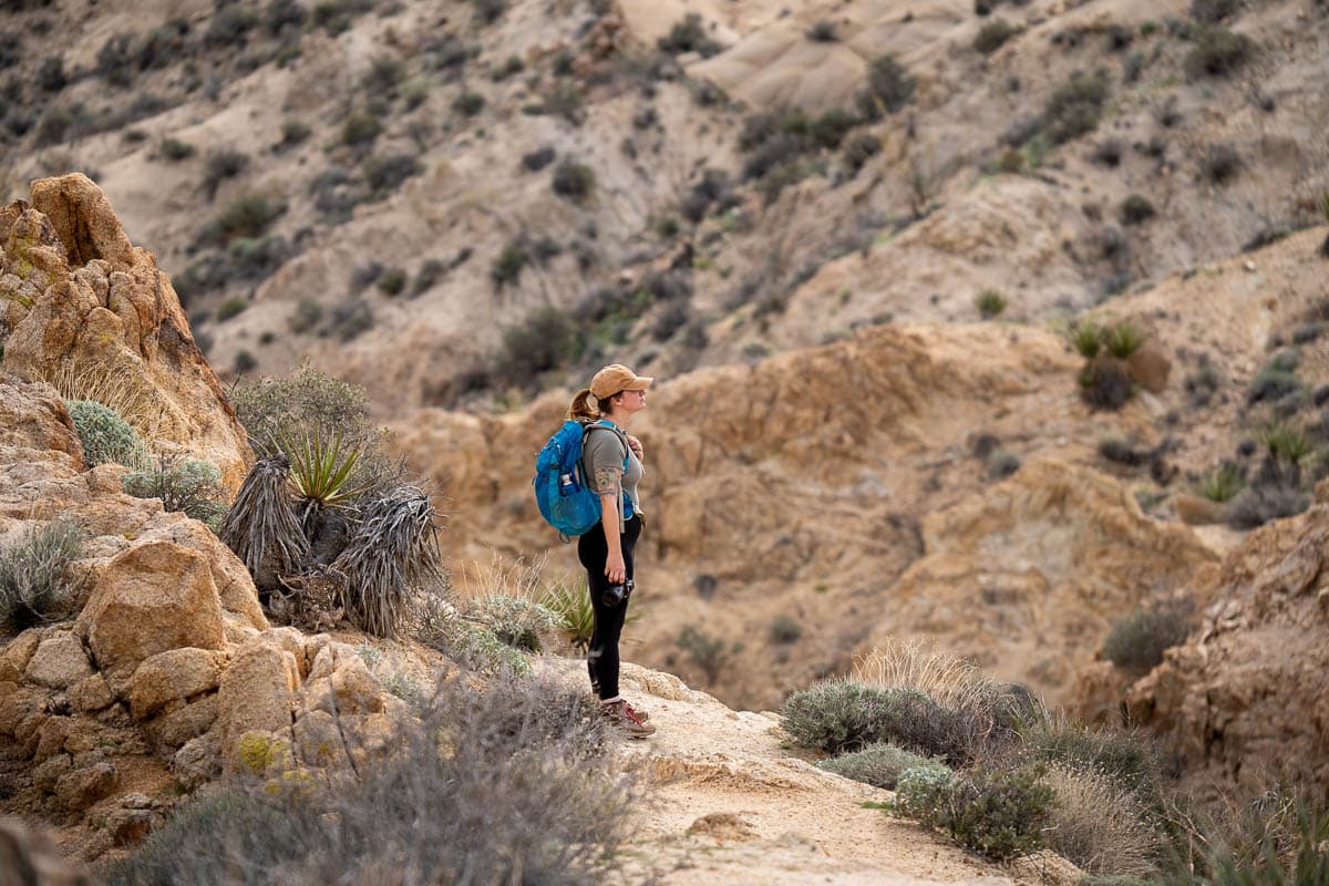 Alternatively, you can continue on past the maintained trail and scramble down a steep hill to walk through the canyon amongst the palm trees. While there’s no official pathway, you can follow the AllTrails map that loops down the hill, through the oasis, and back up the ridgeline. I personally think the scrambling is a bit easier on this portion if you go clockwise.